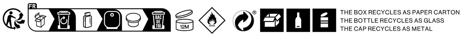 EN (English) Contains: Alcohol denat. 80% VOL, water, parfum, alpha-iso-methylionone, benzyl benzoate, citral, coumarin, citronellol, eugenol, geraniol, linalool, limonene. For external use only. Avoid contact with eyes. To ensure skin compatibility, test the product on a small patch of skin. If irritation occurs, discontinue use and seek medical advice. Store below 21°C / 70°F. Please recycle. FR (French) Contient : Alcool dénaturé 80% VOL, eau, parfum, alpha-iso-méthylionone, benzoate de benzyle, citral, coumarine, citronellol, eugénol, géraniol, linalool, limonène. Pour usage externe uniquement. Évitez tout contact avec les yeux. Pour assurer la compatibilité avec la peau, testez le produit sur une petite zone. En cas d’irritation, arrêtez l'utilisation et consultez un médecin. Conserver en dessous de 21°C / 70°F. Veuillez recycler. DA (Danish) Indeholder: Alkohol denat. 80% VOL, vand, parfume, alpha-iso-methylionon, benzylbenzoat, citral, coumarin, citronellol, eugenol, geraniol, linalool, limonen. Kun til udvortes brug. Undgå kontakt med øjnene. For at sikre hudkompatibilitet, test produktet på et lille hudområde. Hvis irritation opstår, stop brugen og søg lægehjælp. Opbevares under 21°C / 70°F. Genbrug venligst. DE (German )Enthält: Alkohol denat. 80% VOL, Wasser, Parfum, Alpha-Iso-Methylionon, Benzylbenzoat, Citral, Cumarin, Citronellol, Eugenol, Geraniol, Linalool, Limonen. Nur zur äußerlichen Anwendung. Augenkontakt vermeiden. Zur Sicherstellung der Hautverträglichkeit das Produkt auf einer kleinen Hautstelle testen. Bei Reizungen Anwendung abbrechen und ärztlichen Rat einholen. Unter 21°C / 70°F lagern. Bitte recyceln. ES (Spanish) Contiene: Alcohol denat. 80% VOL, agua, perfume, alfa-isometilionona, benzoato de bencilo, citral, cumarina, citronelol, eugenol, geraniol, linalool, limoneno. Solo para uso externo. Evitar el contacto con los ojos. Para garantizar la compatibilidad con la piel, probar el producto en una pequeña área de piel. Si se produce irritación, suspender su uso y consultar a un médico. Conservar por debajo de 21°C / 70°F. Por favor, reciclar. HE (Hebrew - עברית) מכיל: אלכוהול דנט. 80% נפח, מים, בושם, אלפא-איזו-מתיליאונון, בנזיל בנזואט, ציטראל, קומארין, ציטרונלול, אוגנול, גראניול, לינלול, לימונן. לשימוש חיצוני בלבד. להימנע ממגע עם העיניים. לבדוק את התאמת המוצר לעור על ידי מריחה על שטח קטן. אם מתרחשת גירוי, להפסיק את השימוש ולפנות לייעוץ רפואי. לאחסן מתחת ל-21°C / 70°F. נא למחזר. HR (Croatian) Sadrži: Alkohol denat. 80% VOL, voda, parfem, alfa-izo-metilionon, benzil benzoat, citral, kumarin, citronelol, eugenol, geraniol, linalool, limonen. Samo za vanjsku upotrebu. Izbjegavati kontakt s očima. Kako biste osigurali kompatibilnost s kožom, isprobajte proizvod na malom dijelu kože. Ako dođe do iritacije, prekinite upotrebu i potražite savjet liječnika. Čuvati ispod 21°C / 70°F. Molimo reciklirajte. HU (Hungarian) Tartalmaz: Alkohol denat. 80% VOL, víz, parfüm, alfa-izo-metilionon, benzil-benzoát, citrál, kumarin, citronellol, eugenol, geraniol, linalool, limonén. Csak külső használatra. Kerülje a szemmel való érintkezést. A bőrkompatibilitás biztosítása érdekében tesztelje a terméket egy kis bőrfelületen. Ha irritáció lép fel, hagyja abba a használatot, és forduljon orvoshoz. Tárolja 21°C / 70°F alatt. Kérjük, újrahasznosítsa. IT (Italian) Contiene: Alcool denat. 80% VOL, acqua, profumo, alfa-iso-metilionone, benzoato di benzile, citrale, cumarina, citronellolo, eugenolo, geraniolo, linalolo, limonene. Solo per uso esterno. Evitare il contatto con gli occhi. Per garantire la compatibilità con la pelle, testare il prodotto su una piccola area. Se si verifica irritazione, interrompere l’uso e consultare un medico. Conservare sotto i 21°C / 70°F. Si prega di riciclare. NL (Dutch) Bevat: Alcohol denat. 80% VOL, water, parfum, alfa-iso-methylionon, benzylbenzoaat, citral, coumarine, citronellol, eugenol, geraniol, linalool, limoneen. Alleen voor uitwendig gebruik. Vermijd contact met de ogen. Test het product op een klein stukje huid om huidcompatibiliteit te garanderen. Stop het gebruik en raadpleeg een arts als er irritatie optreedt. Bewaren onder 21°C / 70°F. Gelieve te recyclen. NO (Norwegian) Inneholder: Alkohol denat. 80% VOL, vann, parfyme, alfa-iso-metylionon, benzylbenzoat, citral, kumarin, citronellol, eugenol, geraniol, linalool, limonen. Kun for utvendig bruk. Unngå kontakt med øynene. For å sikre hudkompatibilitet, test produktet på et lite hudområde. Hvis irritasjon oppstår, avbryt bruk og oppsøk lege. Oppbevares under 21°C / 70°F. Vennligst resirkuler. SV (Swedish) Innehåller: Alkohol denat. 80% VOL, vatten, parfym, alfa-iso-metyljonon, bensylbensoat, citral, kumarin, citronellol, eugenol, geraniol, linalool, limonen. Endast för utvärtes bruk. Undvik kontakt med ögonen. Testa produkten på ett litet hudområde för att säkerställa hudkompatibilitet. Om irritation uppstår, avbryt användningen och kontakta läkare. Förvara under 21°C / 70°F. Vänligen återvinn. PT (Portuguese) Contém: Álcool desnaturado 80% VOL, água, perfume, alfa-iso-metilionona, benzoato de benzila, citral, cumarina, citronelol, eugenol, geraniol, linalol, limoneno. Apenas para uso externo. Evite contato com os olhos. Para garantir a compatibilidade com a pele, teste o produto em uma pequena área da pele. Se ocorrer irritação, interrompa o uso e consulte um médico. Armazene abaixo de 21°C / 70°F. Por favor, recicle. RO (Romanian) Conține: Alcool denat. 80% VOL, apă, parfum, alfa-izo-metiliononă, benzoat de benzil, citral, cumarină, citronelol, eugenol, geraniol, linalool, limonen. Doar pentru uz extern. Evitați contactul cu och